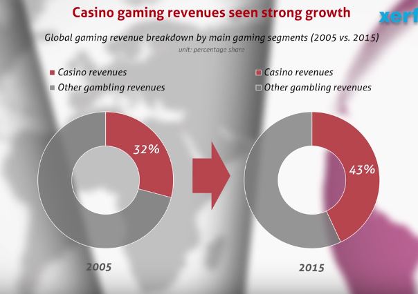 La part des revenus des casinos représentait 43% de la totalité des revenus des jeux d'argent dans le monde en 2015.